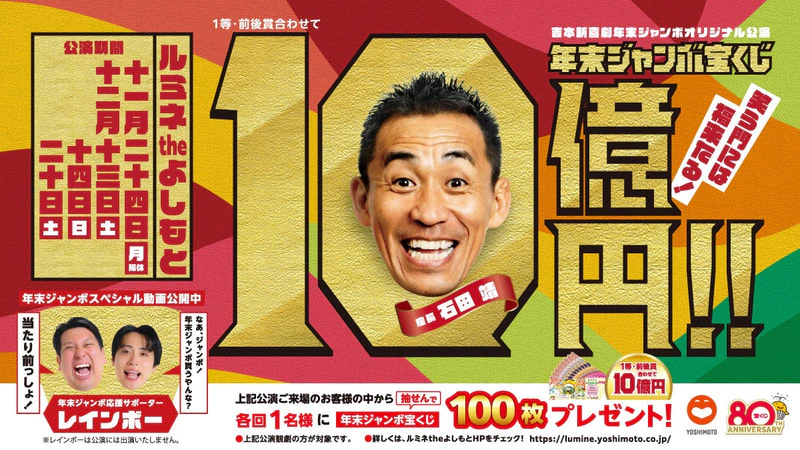 ルミネtheよしもとでは、下記の4日間計12公演を対象に、石田靖座長による「年末ジャンボ」をテーマにした『年末ジャンボ 吉本新喜劇オリジナル公演』を開催いたします。